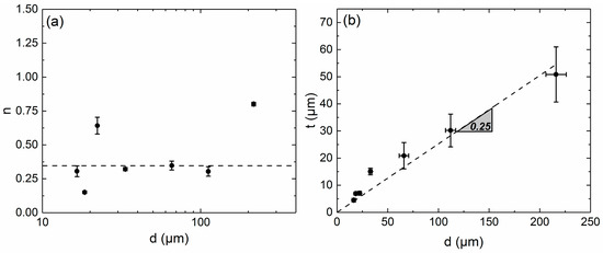 Figure 3 shows microstructural features associated with annealing twin boundaries. The number of annealing twin boundaries per grain (n) and the average thickness of annealing twins (t) are plotted as a function of the mean grain size (d) in Figure 3a,b, respectively. Despite some scatter, n is roughly constant and equal to 0.35 ± 0.1 for all grain sizes (Figure 3a) while t increases linearly with d with a slope of 0.25 ± 0.2. In other words, there are two twin boundaries in one out of six grains and the annealing twin thickness is roughly one quarter of the mean grain size.