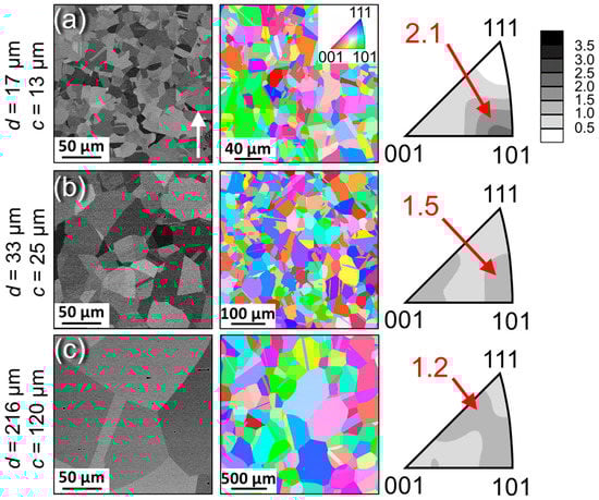 Representative microstructures of recrystallized MnFeNi with different grain and crystallite sizes: (a) d = 17 µm, c = 13 μm, (b) d = 33 µm, c = 25 μm, (c) d = 216 µm, c = 120 μm. Figures in the first column are BSE micrographs, those in the second are color-coded crystallite orientation maps, see colored stereographic triangle in the second column of (a) for color decoding. Figures in the third column are inverse pole figures (IPFs) showing the texture along the longitudinal axis of the compression specimens.