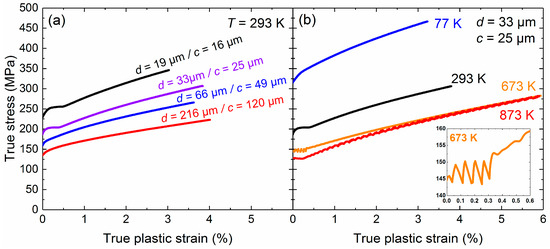 Four representative compression true stress–true plastic strain curves at RT for crystallite sizes between 13 and 120 µm are shown in Figure 5a. The yield stress as well as the flow stress at a given plastic strain are increasing with decreasing crystallite size. The effect of temperature on stress–strain behavior for a grain size of d = 33 µm (c = 25 µm) is shown in Figure 5b. The yield stresses are found to strongly decrease with increasing temperature between 77 and 673 K. However, yield and flow stresses are similar at 673 and 873 K, indicating the beginning of an athermal plateau (see also later Figure 6). Interestingly, while stress–strain curves are smooth at low temperatures, serrations are observed for T > 673 K regardless of the mean grain size. At 673 K the serrations appear right after yielding and disappear after 0.4% strain. In contrast, while the beginning of the stress–strain curve is smooth at 873 K serrations are first observed at 0.4% and are visible until the end of the compression test. The unstable plastic flow observed at high temperatures (T ≥ 673 K) may be attributed to the segregation of substitutional elements at stacking faults bounded by Shockley partials (Suzuki effect [38]) and/or the formation of Cottrell atmospheres [39]. Further work is still needed to clarify the nature of serrated flow occurring above 673 K.