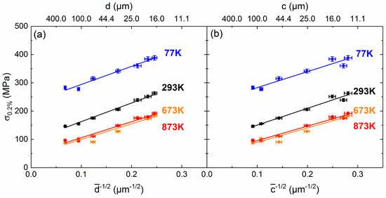 Hall–Petch parameters (σ0 and ky) determined by fitting Equation (1) to the grain size (d, upper part) and crystallite size (c, lower part) data sets obtained at different temperatures.