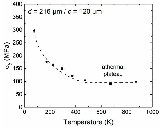 Temperature dependence of the yield strength (σy) obtained for the largest grain size (d = 216 µm, c = 120 µm).