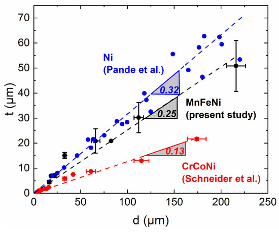 Average annealing twin thickness (t) as a function of the mean grain size (d). The black data points were obtained for MnFeNi in the present study, whereas the blue points were obtained from Pande et al. [42] for pure Ni and the red ones by Schneider et al. [21] for an equiatomic CrCoNi alloy.