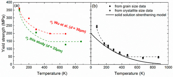 Temperature dependence of (a) yield strength obtained by Wu et al. [9] (red points) for a grain size of 30 µm compared to values obtained in the present study for a grain size of 33 µm (green points) and (b) intrinsic lattice strength of a polycrystal with an infinite grain/crystallite size. Black data points were obtained from Figure 6a by extrapolating the Hall–Petch plots to an infinite grain size while the empty symbols were determined by extrapolating the plots to an infinite crystallite size (Figure 6b). Also shown in (b) is the temperature dependence of the intrinsic lattice strength (black line) computed using the solid solution strengthening model of Varvenne et al. [47].