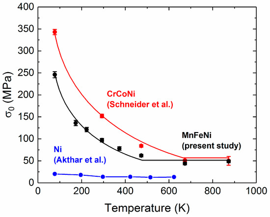 To illustrate the degree of solid solution strengthening of the MnFeNi alloy, the temperature dependence of its intrinsic lattice strength (black points) is compared with that of pure Ni (blue points) [50] and CrCoNi (red points) [21] in Figure 12. It can be clearly seen, that both MEAs alloys display a strong decrease of intrinsic lattice strength with increasing temperature. This is in contrast with pure Ni (blue points) which exhibits a very weak decrease with increasing temperature from 20 MPa at 77 K to 15 MPa at 623 K. This may be attributed to the fact that solid solution strengthening does not contribute to its intrinsic lattice strength, which only consists of the Peierls–Nabarro stress. At a temperature of 77 K, the strength of the CrCoNi alloy is much higher than that of the MnFeNi alloy (~40%) but this difference gradually decreases with increasing temperature until both curves merge at the athermal plateau in excellent agreement with results obtained by Wu et al. [9]. At T > 673 K, both alloys exhibit roughly the same intrinsic lattice strength (~50 MPa). From Figure 12 it can be seen that CrCoNi exhibits a higher yield strength in the range 77–673 K than MnFeNi, suggesting that different combinations of elements results in different magnitudes of solid solution strengthening, i.e., a combination of Cr and Co has a stronger effect on solid solution strengthening of Ni than a combination of Mn and Fe.