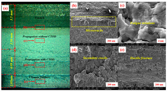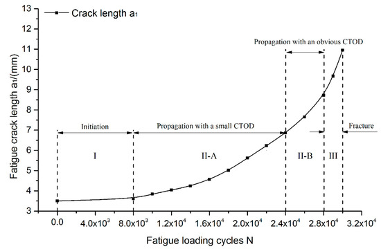 4.3. Relationship between Characteristic Parameters and Fatigue Loading Cycles, Fatigue Crack Length