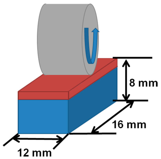 As one of the most used wear test techniques, the ring-block wear test [14,15] was employed to evaluate the wear resistance of the laser-cladded coating. The as-prepared specimen was cut into specimens with dimensions of 12 mm × 16 mm × 8 mm without surface grinding. The wear surface possessed dimensions of 12 mm × 16 mm, as shown in the illustration presented in Figure 1. The wear test was conducted under the dry condition without temperature controlling at room temperature. A M2000 block-on-ring wear test machine (Kesheng, Shandong, China) was employed to conduct the ring-block wear test with a sliding velocity of 0.471 m·s−1 for 30 min. According to the previous literature [16], the applied load was selected to be 100 N. The anti-friction rings were fabricated by GCr15 with a hardness of 750 HV0.3, a diameter of 45 mm, and a thickness of 12 mm.