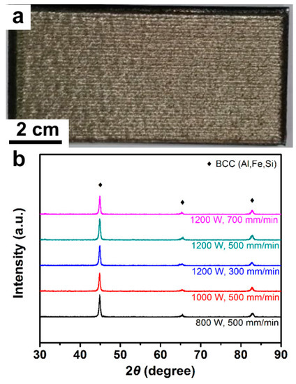 The XRD spectra of the Fe–Si–Al coating specimens are shown in Figure 3b. The five XRD spectra present very similar shapes. There are three obvious peaks sitting at ~44.9°, 65.5°, and 82.8° and several small peaks can also be observed. After calibration, all the peaks were confirmed to correspond to the (Al, Fe, Si) solid solution phase with a body-centered cubic (BCC) structure. Thus, the XRD results indicate that the five laser-cladded coatings all consist of the (Al, Fe, Si) solid solution phase. The structure of the Fe–Si–Al coating is quite stable under different cladding parameters.