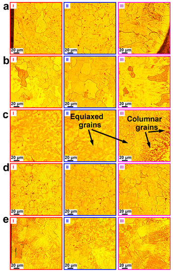 Figure S3 in the Supplementary Materials shows optical microscope images of the whole cladded layer of the Fe–Si–Al coating specimens. The thicknesses of coating specimen 1–specimen 5 were measured to be about 1.39 mm, 1.57 mm, 2.37 mm, 1.73 mm, and 1.27 mm, respectively. No obvious cracks and very few pores could be found on any of the specimens, indicating the high cladding quality of the prepared Fe–Si–Al coatings. Figure 4 shows the enlarged optical microscope images. Areas I, II, and III show the top, middle, and bottom of the cladded layer, respectively. These cladding layers consist of columnar grains and equiaxed grains. The columnar grains are located adjacent to the carbon steel substrate and then translated into equiaxed grains up to the top of the cladded layer.