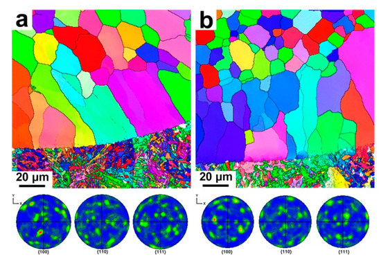 Above the fusion line, a layer of columnar grains followed by equiaxed grains were observed. There were some small angle grain boundaries in the columnar grains (see the dashed line in Figure 4a). According to the previous literature [8,21], these columnar grains may grow epitaxially from parent grains in the HAZ along the heat flux direction. Then, due to the weaker thermal gradient, the epitaxial growth stops, and equiaxed grains form. The corresponding {100}, {110}, and {111} pole figures of specimen 1 are also presented in Figure 4a. The signal dispersed in the pole figures, indicating a random texture in the Fe–Si–Al cladding. Similar morphology was observed in the other Fe–Si–Al coating specimens, as shown in Figure 4b.