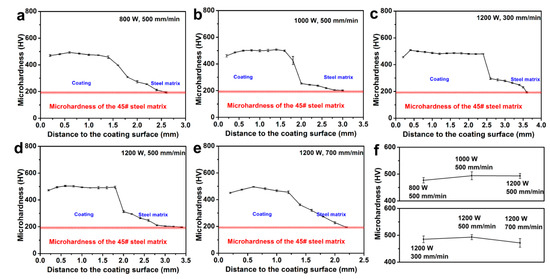 The microhardness distribution of Fe–Si–Al-cladded specimen 1–specimen 5 is presented in Figure 6a–e, respectively. It can be seen that the five curves exhibit very similar tendencies. In the cladded layer, the microhardness keeps a high value approaching 500 HV0.3. Some microhardness fluctuation was noticed in this area, which was caused by the changing of the grain sizes, as presented in Figure 4. At the edge of the cladded layer, the microhardness rapidly dropped to about 300 HV0.3 due to the significant difference between the cladded layer and the steel matrix. Then, the microhardness slowly dropped to a value equal to that of the steel matrix in the HAZ. Because the steel matrix was subjected to an annealing process before the laser cladding process, the rapid heating and cooling effect of the laser cladding can refine the grain and increase the microhardness of the HAZ. However, the grain refinement effect will decrease with the increasing distance from the cladded layer, resulting a slow drop of the microhardness in the HAZ.