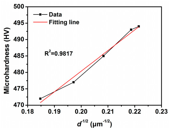 The Hall-Petch equation quantitatively describes the strength increasing with the decreasing grain size in single-phase alloys [22]. According to the Hall-Petch equation, the relationship between the yield strength σs and the grain size d of metals can be described as follows: