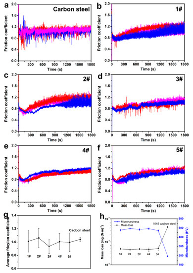 The friction coefficient variation curves of (a) the 1045 carbon steel and (b–f) coating specimen 1–specimen 5, (g) the average friction coefficient, and (h) the mass loss and microhardness comparison of the coating specimens and the 1045 carbon steel.