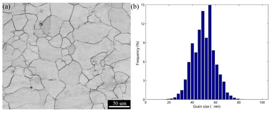 An AZ31B magnesium alloy bar with the diameter of 4.8 mm was used. The bar whose chemical composition is shown in Table 1 was annealed at the temperature of 618 K for 60 min to obtain a homogeneous coarse grain (CG) microstructure. To reveal the microstructure of the base material, the bar was mechanically polished and then etched in a 5 g picric acid + 10 mL water + 10 mL acetic acid + 100 mL ethanol solution for ~10 s. The etched surface was observed by the optical microscope (Olympus BX51M, Tokyo, Japan). Figure 1 shows the initial microstructure and grain size distribution of the base material. The mean grain size of initial workpiece is ~50 µm.