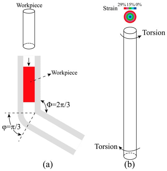 The initial AZ31B bar was deformed by using two types of deformation mode. Figure 2 shows the schematics of the two deformation modes. In Figure 2a, the initial AZ31B bar was processed by means of equal channel angular pressing (ECAP) where the inner angular Φ is and the outer angular is . Using the strain estimation Equation [], the effective plastic strain of 0.6 was imposed in workpiece after one pass of ECAP. In Figure 2b, the initial AZ31B with the length of 150 mm was torqued by the radian of . The effective plastic strain is calculated by , where is the distance departing from the center of bar. Figure 2b illustrates the effective plastic strain distribution in the cross-section. The strain gradient during torsion is 1/m.