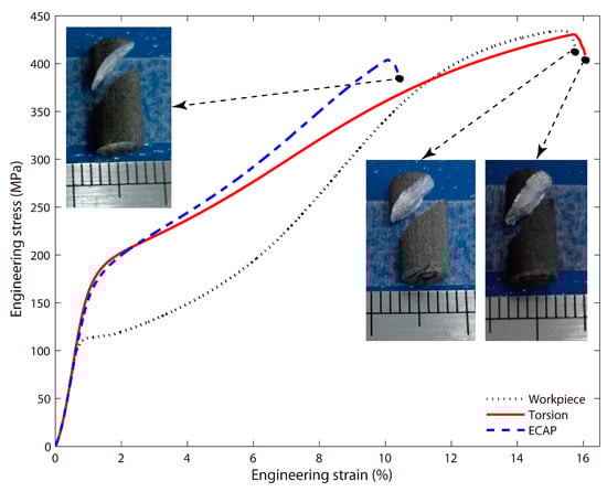 Engineering stress vs. engineering strain curves for AZ31B processed by different deformation modes (the fractured samples shown at the end of stress-strain curves).