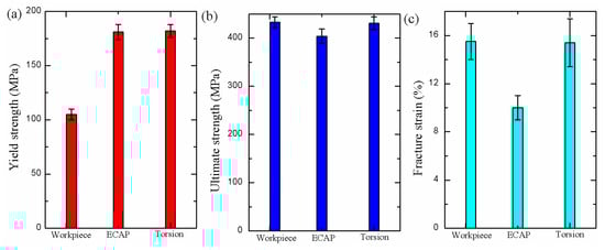 Comparisons of mechanical properties of AZ31B processed by different deformation modes: (a) yield strength; (b) ultimate strength; (c) fracture strain.