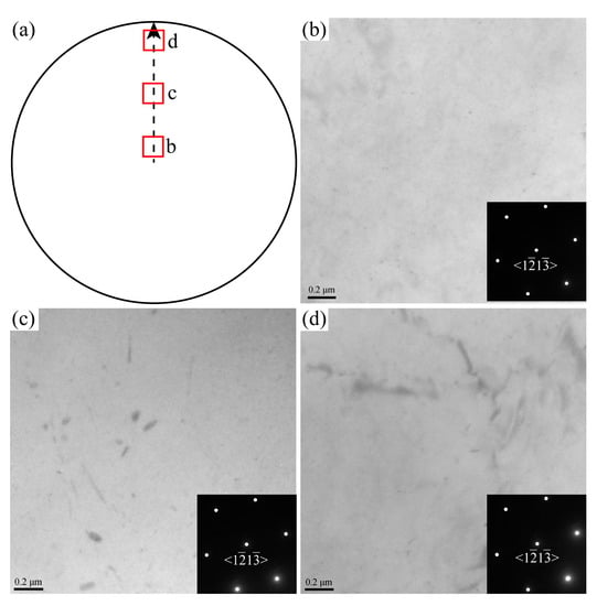 TEM observation of AZ31B initial workpiece along a direction: (a) schematic of the three observed positions; (b) center of bar; (c) middle zone; (d) outer zone.