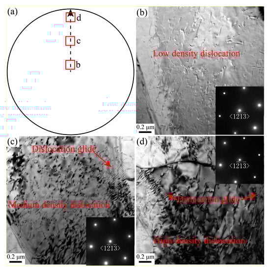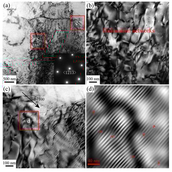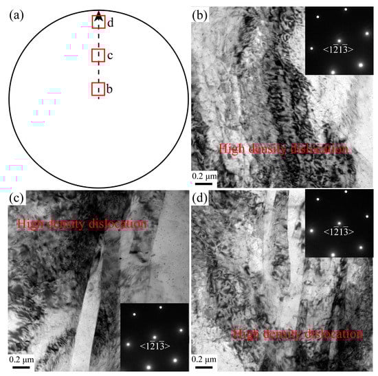 In Equation (A1), is dislocation density, the volume of observed region is determined by multiplying the area () by the sample thickness (). In TEM image of Figure A1a, at least five different regions were chosen to measure the dislocation density. Substituting the length of dislocation lines () measured in Figure A1c into Equation (A1), the dislocation density was obtained. The mean dislocation density of at least five different regions was calculated to determine the dislocation density of Figure A1a.