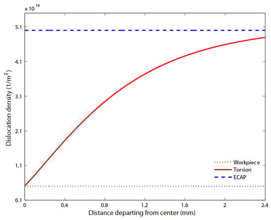In Equation (12), and . Combining Equations (11) and (12), SSD density in AZ31B, processed by pure torsion , is obtained by calculating . plus gives the dislocation distribution in AZ31B processed pure torsion, which is illustrated by the red line in Figure 9. The dislocation density of AZ31B processed by ECAP is higher than that of the initial workpiece. This explains the higher yield strength in Figure 3. As for AZ31B processed by pure torsion, the strain gradient induces the gradient of dislocation density. Compared with the initial workpiece, AZ31B processed by pure torsion possesses higher mean dislocation density and the dislocation density gradient. The high yield strength and high ductility of AZ31B in Figure 3 are attributed to the combination of high dislocation density and dislocation density gradient.