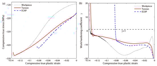 where is the compressive true stress and is the compressive true strain. If , deformation localization happens during the compression loading process. Based on the experimental data in Figure 3, the compressive true stress vs. compressive true plastic strain curves are shown in Figure 10a and the corresponding work hardening coefficients are illustrated in Figure 10b. The strain for flow localization of AZ31B processed by ECAP is less than that of initial AZ31B. The strain for flow localization of AZ31B processed by pure torsion is nearly the same as that of initial workpiece. As shown in Figure 10b, the good work hardening property can lead to the large fracture strain. According to Equations (7) and (8), the method of imposing strain gradient on materials is valid to improve the ductility of magnesium alloy.