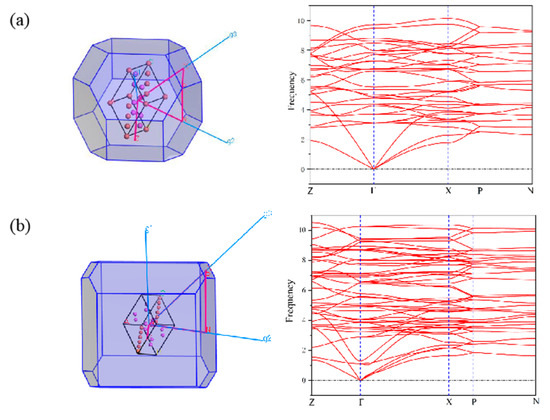 All density functional theory (DFT) based first-principles calculations in this work including geometry optimization, total energy, and electronic structure calculations, were performed by the Vienna Ab initio Simulation Package (VASP) [16,17]. The generalized gradient approximations (GGA) of the Perdew–Burke–Ernzerhof (PBE) type were adopted for the exchange correlation potential [18]. The projection-augmented wave (PAW) method [19] was applied to simulate the potentials between electrons and ions. A plane wave basis was used to expand the wave functions with a cut-off energy of 500 eV. The Monkhorst–Pack scheme [20] was selected for the k-point sampling in the Brillouin zone (7 × 7 × 9 for both new phases). The static self-consistent convergence criteria were set at 1 × 10−6 eV/atom. The phonon spectrums were simulated using the supercell approach, by utilizing the Phonopy package [21].
