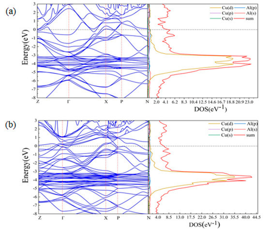 Considering the present assumptions might stimulate further experimental work, the electronic properties of the newly proposed M1 and M2 phases were also calculated including the band structure and density of states. As seen in Figure 6a,b, one can see that the energy band of both phases crossed the Fermi surface, indicating that they are still metallic. The density of states of both the M1 and M2 phases were quite similar, except that the density of states (DOS) at the Fermi level of the M2 was much higher than that of the M1 phase, as it contained more atoms. Their DOS could be divided into two regions—the one shown from −6 to −2 eV is mainly contributed by the Cu d states while the remaining region is mainly contributed by the Al s and p states.