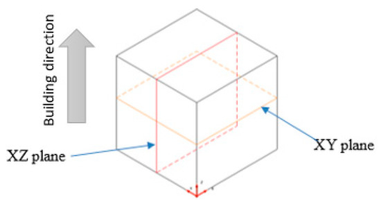 The Archimedes method was used to calculate the relative densities of the specimens manufactured under the various process parameters. Then, porosity was determined by computing the difference between the theoretical and the measured relative densities. The Archimedes density test method is well described in [33]. The samples were weighed in air as well as distilled water at 20 °C temperature and standard pressure with the aid of a precision scale. The theoretical density of maraging steel 300 was taken as 8.1 g/cm3 which is in line with related literature [9,34]. An important consideration when measuring density using this method is to ensure that no open pores exist that would allow the penetration of water into the specimens [35]. Open pores can easily be detected by observation of air bubbles during immersion of the specimen into the water, and such samples must be sealed [33]. One limitation with the Archimedes method is that it cannot provide information about the size or distribution of internal pores. Therefore, further to the Archimedes density tests, 2D optical microscopy of sectioned and polished specimens was also performed to inspect the internal pores associated with the different parameter combinations. The cubes were sectioned along the planes shown in Figure 2.