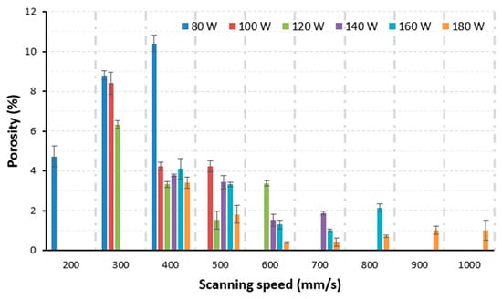 The porosity results for samples built on the M2 Laser Cusing system are illustrated in Figure 4. High values of porosity were recorded for the lowest laser power of 80 W at 300 mm/s and 400 mm/s respectively. Laser power of 180 W yielded the least porosity of 0.39% for a scanning speed of 600 mm/s. The general trend is that the relative density increases as the scanning speed is gradually increased to some optimum value, above which this relative density begins to decline. The optimum scanning speed that coincides with the least porosity is unique to the laser power being used, with other parameters such as spot size and hatch distance held constant. For example, when scanning with 180 W, the optimum speed that results in the least porosity is 600 mm/s. Above or below this scanning speed, porosity tends to increase. The increase in porosity on either side of the optimum scanning speed is due to a mismatch between the laser power and scanning speed, which leads to either balling, insufficient melting, and poor metallurgical bonding (for higher scanning speeds), or over-heating (for lower scanning speeds). These scenarios lead to undesirable porosity, which reduces the part strength [38,39]. For the tested range, scanning speeds lower than the optimum scanning speed contribute to significantly higher porosity than those above it (Figure 4).