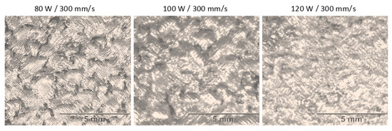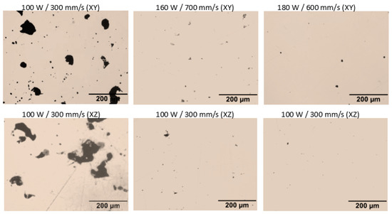Optical microscope images were taken across (XY) and along (XZ) the building directions of the cube specimens. The concentration of pores (represented by the dark spots) in the microscope images shown in Figure 5 is consistent with the porosity results from the Archimedes test. In Figure 5, the concentration and size of pores is higher for the 100 W/300 mm/s compared to the 160 W/700 mm/s and 180 W/600 mm/s ones. The pores for the 100 W/300 mm/s specimen have diameters of up to 200 µm, compared to a maximum of only 15 µm for the 180 W/600 mm/s specimen.