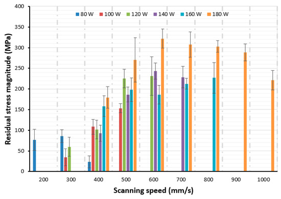 Figure 7. Variation of residual stress magnitude with laser power and scanning speed (30-µm layer).