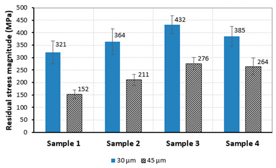 Figure 8. Residual stress magnitude comparison for 30-µm and 45-µm layer thicknesses at 180 W and 600 mm/s for samples manufactured on the EOSINT M280 machine.