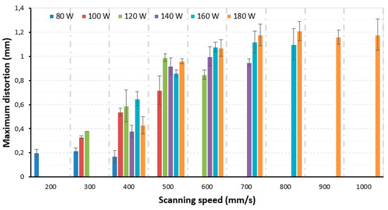 The influence of laser power and scanning speed on distortions is shown in Figure 10. Generally, distortions initially increase to a maximum before steadily declining as the scanning speed and laser power are increased. The two input parameters directly influence the localized temperature gradients. At 180 W and 30 µm, the distortion increases from 0.4 mm at 400 mm/s to 1.2 mm at 800 mm/s. This trend can be attributed to the decrease in porosity that tends to increase residual stresses as the scanning speed is increased for this range of parameters. Similar behavior is observed for the other laser power/scanning speed combinations, except where the laser power was 100 W, possibly because this power level was only investigated with a maximum scanning speed of 500 mm/s. It is expected that scanning speeds higher than 500 mm/s would have resulted in diminishing distortion.