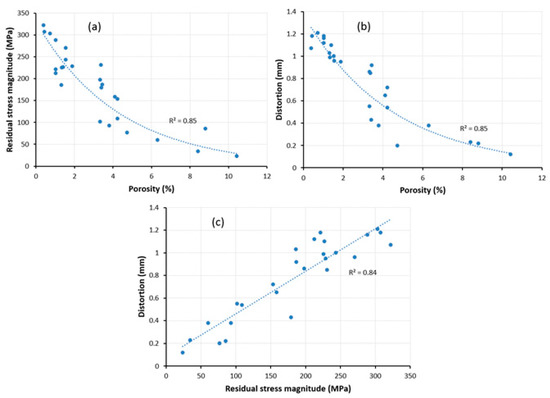 Process parameters that contributed to high density also contributed to the high cantilever distortions. It is also readily clear that porous parts suffer lower residual stresses compared to their less porous counterparts. To understand the correlations existing between these responses (porosity, residual stresses, and distortions), three further interrelationships between the process outcomes were investigated namely: porosity versus residual stresses, porosity versus distortions, and residual stresses versus distortions. The scatter plot in Figure 11a shows that pores indeed have the effect of relaxing residual stresses. The highest residual stress magnitude of 322 MPa corresponds to the lowest porosity of 0.39%, whereas the highest porosity (10.42%) is associated with the lowest residual stress of 23 MPa. The R2 value of 0.85 shows closeness between the data and fitted regression. The residual stress relaxation effect of pores in turn results in diminished distortion. The higher the porosity, the less distortion the cantilevers experience. The influence of porosity on distortion is shown in Figure 11b. Process parameters that yielded low residual stresses resulted in very little cantilever distortions, whereas parameters that contributed to higher residual stresses also, generally, contributed to higher cantilever distortions, as shown in Figure 11c. Within the 0.95 confidence interval, a very strong statistical correlation of 0.91 exists between residual stress and distortion magnitudes.