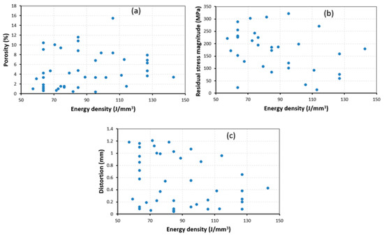 Energy density can be computed from Equation (1), where P is the laser power, v is the scanning speed, h represents the hatch distance and t represents the powder layer thickness. In this paper, the hatch spacing was held constant; therefore, only the laser power, scanning speed, and layer thickness contributed to the energy density. When parameters are varied simultaneously, there is no observable influence of energy density on any of the responses (porosity, residual stresses, and distortions), as shown in Figure 12. Thus, energy density cannot be used to explain or account for the differences in the observed process outcomes. This also shows that laser power and scanning speed do not have the same weighted effect on the process. Similar observations were made by Prashanth et al. [47], who suggested that the energy density equation might need modification.
