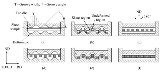 Schematic of the constrained groove pressing (CGP) process: (a) Preparation; (b) press 1; (c) flat 1; (d) sample rotation; (e) press 2; (f) flat 2. Reproduced from [], with permission from Elsevier, 2019.