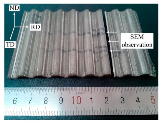 Due to exceptional physical, mechanical, and functional properties, ultra-fine grained (UFG) materials have gained great interest subjects in recent years []. Severe plastic deformation (SPD) has been widely accepted as a straightforward and effective way of producing bulk UFG materials []. Constrained groove pressing (CGP), originally proposed by Shin et al., is one of the versatile SPD methods suitable for fabrication of UFG metallic sheets [,]. During the CGP process, as shown in Figure 1, a set of asymmetrically groove dies and a set of flat dies are employed to perform alternate groove pressing and flattening on sheet metals. Based on the die constraint, the asymmetry of groove dies and the 180° rotation of sheet sample around its normal direction (ND), theoretically, pure shear deformation will be imposed to the whole sheet sample without obvious changes in its dimensions. Thus, by repeating this process, a large amount of plastic strain could be homogeneously accumulated into the materials and UFG structures as well as enhanced properties are expected to be obtained []. Until now, CGP has been successfully used for grain refinement and property improvement of various pure metals and alloys [].