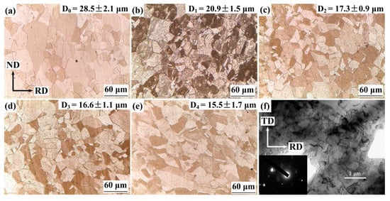 Microstructure evolution of nickel sheets during CGP in Scheme 2: (a) As-annealed; (b) pass 1; (c) pass 2; (d) pass 3; (e) pass 4; (f) pass 4 (TEM micrograph with selected-area electron diffraction (SAED) patterns). D0, D1, D2, D3 and D4 indicate the estimated grain sizes.