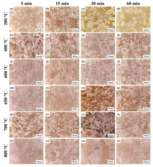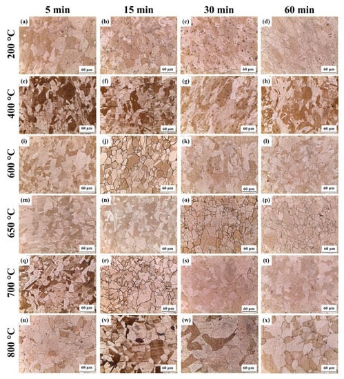 Figure 6 and Figure 7 present the optical microstructure of CGP nickel sheets after pass 1 and pass 2 with subsequent annealing at different temperatures and time, respectively. The microstructures annealed at temperatures below 600 °C had little difference from each other and hence only those at 200 and 400 °C were given here. Corresponding grain sizes estimated by line intercept method were illustrated in Figure 8a,b. As shown in Figure 6 and Figure 8a, for CGP nickel sheets after pass 1, the variations of both grain size and micro-hardness against annealing temperature experienced three stages. At first, insignificant increase of grain size was observed when annealed at temperatures below 650 °C, and shear deformation characteristics of microstructure gradually disappeared with the increase of temperature. Usually, elongated grains/subgrains formed after CGP due to its deformation mode and inhomogeneous strain distribution especially during the last passes, as shown in Figure 5e,f. Micro shear-bands could also be observed in the microstructure, as presented in Figure 4. When annealing, an aspect ratio enhancement with increasing the temperature occurred owing to strain induced grain boundary migration phenomenon. This suggested that annealing in this range facilitated the restoration phenomenon by releasing the residual stress and stored energy of the deformed materials []. Partial recrystallization occurred at the same time when annealed for no less than 15 min and the microstructure was similar to the initial state (before CGP). However, as for the micro-hardness, it experienced slight decrease below 600 °C while at 650 °C the effect of annealing time was more remarkable, and the micro-hardness decreased obviously with increasing the annealing time. Then, annealing at a higher temperature of 700 °C resulted into great increase of grain size accompanied by dramatic decrease of micro-hardness, indicating the completion of recrystallization and grain growth. Finally, continuing slight grain growth was evident at temperatures higher than 700 °C while negligible recovery of micro-hardness was observed, which might be recognized as annealing strengthening []. In addition, generally, the influence of annealing temperature on the microstructure of CGP nickel sheets was more remarkable than that of annealing time in the range from 5 to 60 min.