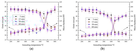 For CGP nickel sheets after pass 2, similar variation trends of microstructure and micro-hardness against annealing temperature and time are displayed in Figure 7 and Figure 8b. However, due to doubled effective plastic strain induced by two CGP passes, several differences could be figured out from Figure 8. Firstly, the dramatic decrease of micro-hardness as well as increase of grain size occurred at 600 °C, instead of 650 °C for pass 1, demonstrating lower thermal stability caused by higher strain. This suggested that the internal elastic stresses and accumulated energy increased with CGP pass number, leading to higher driving force of recovery and recrystallization []. Similar results were obtained in materials processed by other SPD methods [,]. Secondly, it was found that imposing higher strain by more passes obviously facilitated the microstructure refinement after post-deformation annealing treatment. For example, the largest grain size of about 50 μm for the materials after pass 1 was obtained when annealed at 800 °C for 1 h while that for pass 2 was only around 40 μm. This could be interpreted by the higher stored energy and dislocation density which favored the grain nucleation procedure through providing the necessary driving force and preferred nucleation sites []. Thirdly, the effect of annealing time on variation of micro-hardness was more insignificant when heating materials deformed by more passes especially at higher temperatures. For instance, as shown in Figure 8a, longer annealing time resulted into lower micro-hardness, which was more remarkable at temperatures above 600 °C. Interestingly, slight recovery of micro-hardness was also observed in Figure 8a when annealing at 800 °C for no less than 15 min. This demonstrated that annealing strengthening caused by the rearrangement of dislocation during restoration occurred evidently for the materials after pass 1, and a short annealing time like 5 min may not induce this phenomenon [,].