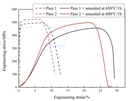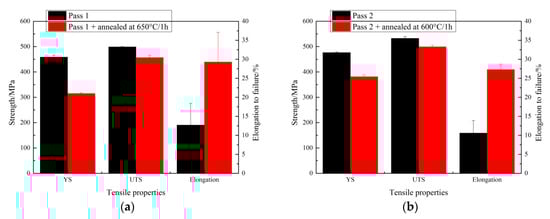 As discussed above, in this study, the optimum annealing temperature for CGP nickel sheets by one and two passes was determined as 650 and 600 °C, respectively, and it was believed to enhance the deteriorated ductility of SPD sheets by the heat treatment. Thus, for verification, RT tensile tests were conducted for the CGP sheets before and after post-deformation annealing for 1 h, and the engineering stress-strain curves and corresponding tensile properties were given in Figure 9 and Figure 10, respectively. Obviously, adequate annealing effectively improved the ductility without noticeable decrease in the strength of CGP nickel sheets at 650 and 600 °C for pass 1 and pass 2, respectively. For the sheets after pass 1, as shown in Figure 10a, the YS and UTS decreased from 458.5 and 499.1 MPa to 315 and 457 MPa, respectively, while the elongation to failure increased remarkably from 10.6% to 27.3%. Similarly for pass 2, the elongation increased to 29.3% from the as-deformed 12.7%, accompanied by slight drop of YS and UTS. From this point, annealing of severely deformed materials at a proper temperature before recrystallization started could restore their ductility with an acceptable decrease in the strength, especially the UTS, which must be an effective complementary approach for SPD methods [].