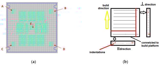 The hardness measurement was performed on metallographic cuts using a Shimadzu HMV2 (Shimadzu, Kyoto, Japan), a load of 980.7 mN, and a dwell time of 15 s (HV 0.1). The measuring pattern is shown in Figure 1b. For each position on the build platform, 30 indentations were carried out in each direction.