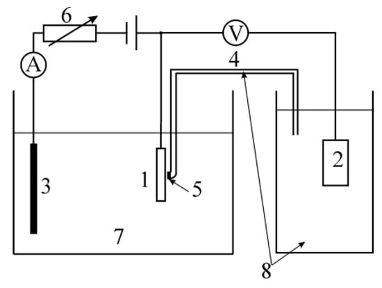 Three electrode system: 1—test sample (working electrode), 2—SCE (reference electrode), 3—Pt auxiliary electrode, 4—salt bridge, 5—semipermeable membrane, 6—adjustable voltage source, 7—electrolyte, 8—solution of own ions of reference electrode.