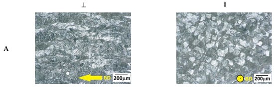 The microstructure of the samples in two perpendicular directions is shown in Figure 3 at lower magnification and in Figure 4 at higher magnification.