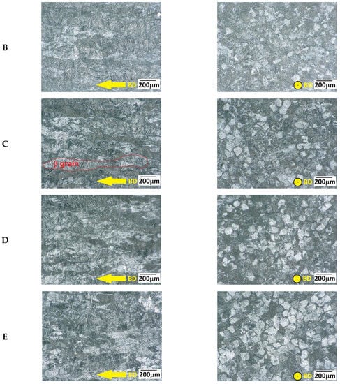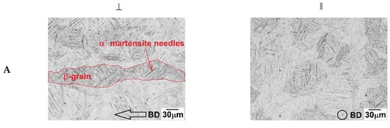 In the ‖ direction, almost polyhedral grains of very close diameter are observed, corresponding to the sections through the columnar primary β grains. In the ⊥ direction, the mostly long grains of β phase are observed parallel to the building direction, across several sintered layers. A very similar microstructure was observed by Weißmann [], Konečná [], and Syed [].