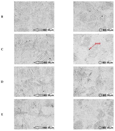 Samples collected from five positions and two directions showed very similar microstructures. The microstructure consisted of primary β grains. They can be seen above all at low magnification (Figure 3C⊥). They transformed during repeated cooling/heating to fine Widmanstätten α′-martensite needles in primary β grains (Figure 4A⊥). In the microstructure, few micropores were observed at higher magnification (Figure 4) as a consequence of gas entrapped in the fusion zone during the DMLS process. Lack-of-fusion defects were not present in the micrographs. The type of microstructure and presence of discontinuities are consequences of thermal conditions during the sintering process. According to Ramesh Raju [], heating and cooling conditions are considered to be the significant factor that is controlled by sintering parameters.