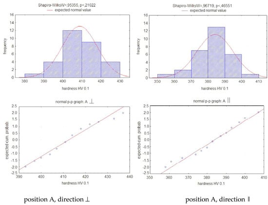 A Shapiro–Wilk normality test was performed for each set of measured values. The test output was a histogram and a p–p graph. An example for the sample at position A and both directions is shown in Figure 5.