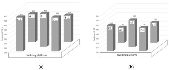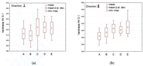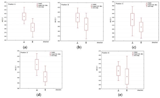 From Figure 7, it is obvious that the mean hardness values in the ‖ direction are lower than the ⊥ direction in all positions on the platform. The variation range (min–max range) of the hardness values is wider in the ‖ direction in positions A, B, and E. In positions C and D, the variation range is wider in the ⊥ direction.