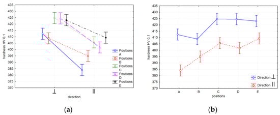 The hardness of the material in particular positions in the (a) ⊥ and (b) ‖ directions.