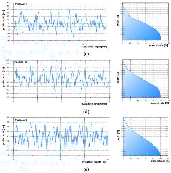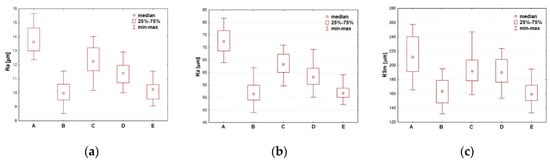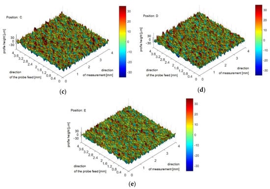 - Roughness: Values of roughness parameters varied as follows within the studied positions: Ra 10–14 µm, Rz 52–70 µm, RSm 160–213 µm. Pairs of close values that did not exhibit statistically significant differences are: for Ra positions, B–E and C–D, for Rz positions, B-E, and for RSm positions, A–C, A–D, B–E, and C–D.