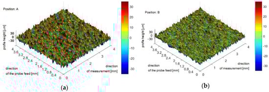 The 3D surface texture was created by a contact profilometer. The resulting spatial image of the surface was generated by aligning the profilographs obtained by scanning parallel planes (perpendicular to the sample building direction) at a defined scanning distance of 0.1 mm. To display one type of surface, an X × Y × Z data matrix was available, where X was the number of rows, each row containing a certain number of measured discrete points of the profile on the evaluated length as the profile height deviation (Z) from the mean line of the profile, and Y was the number of columns, i.e., number of parallel planes. For 3D surface representation, the measured data were covered by surface area using Matlab R2017a software, MathWorks Inc., Natick, MA, USA.